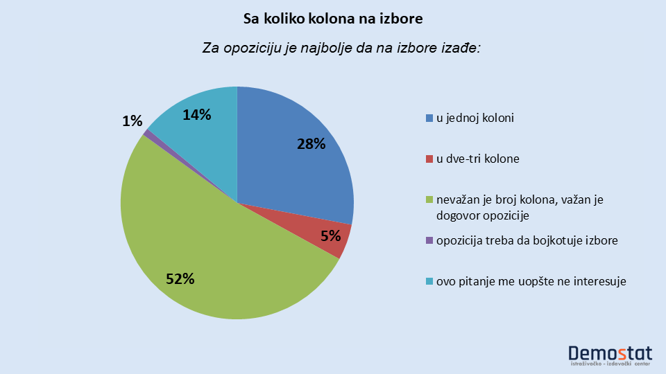 Najveći broj Beograđana (52%) priklonilo se mišljenju da je broj kolona nevažan a da je važan dogovor opozicije. Za jednu opozicionu kolonu izjasnilo se 28% Beograđana, za dve-tri kolone 5%, dok je 14% Beograđana reklo da ih to pitanje ne interesuje.