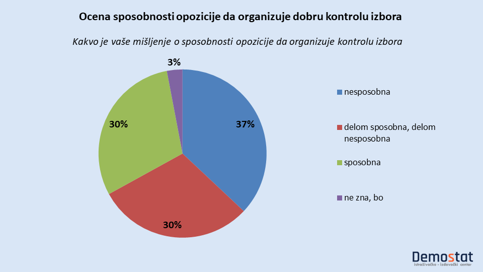 Više je Beograđana koji misle da je opozicija nesposobna da organizuje dobru kontrolu izbora (37%) nego onih koji su uverenu u sposobost opozicije za ovaj posao (30%). Pri tom, nepuna trećina ispitanika (30%) misli da je opozicija polovično sposbna.