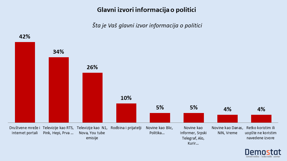 Beograđani se o politici najčešće informišu preko društvenih mreža i internet portala (42%), potom preko televizijskih kanala kao što su RTS; Pink, Hepi, Prva (34%) i preko televizija kao pto su N1, Nova, You tube emisija (26).