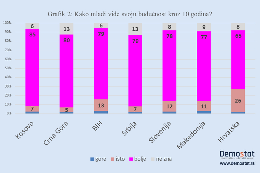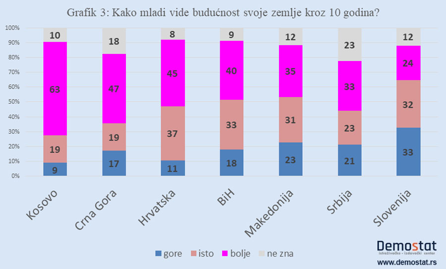 Međutim, kad mladi razmišljaju o budućnosti društva u kojem žive, naglašeni optimizam nestaje a i razlike među državama postaju vidljivije (Grafik 3). Najpre, u svim zemljama je, sudeći po očekivanjima mladih, budućnost društva znatno manje ružičasta nego kada se radi o njihovoj vlastitoj budućnosti. Jedino na Kosovu mladi koji veruju da će u budućnosti biti bolje predstavljaju većinu. U Srbiji, tek trećina veruje da će biti bolje, četvrtina veruje da će biti isto a svaki peti da će biti gore. Upadljivo je da za četvrtinu mladih u Srbiji, što je značajno veći procenat nego u ostalim državama, budućnost neprozirna. Srbija ipak ne prednjači u pesimističkim prognozama. Začudo, jedina država u kojoj je, u poređenju sa Srbijom, manji procenat onih koji veruju da će biti bolje a veći procenat onih koji se plaše da će biti gore je – Slovenija. Ipak, rekli bismo, nije svejedno da li neko misli da će kroz deset godina stanje u društvu ostati na istom nivou kakvo je sada u Sloveniji ili na nivou kakvo je sada u Srbiji.