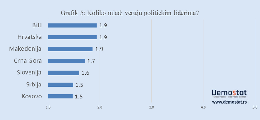 Kada smo mlade pitali koliko veruju svojim političkim liderima, opet se pojavila sličnost među njima (Grafik 5). Poverenje u političare je podjednako nisko, razlike su male, i stepen poverenja, izražen ocenama od 1 do 5, kreće se od 1,5 do 1,9. Srbija je na začelju, ali nije velika razlika između stepena poverenja koje bi na skali od 1 do 5 bio izražen ocenom 1,5 i ocenom 1,9.