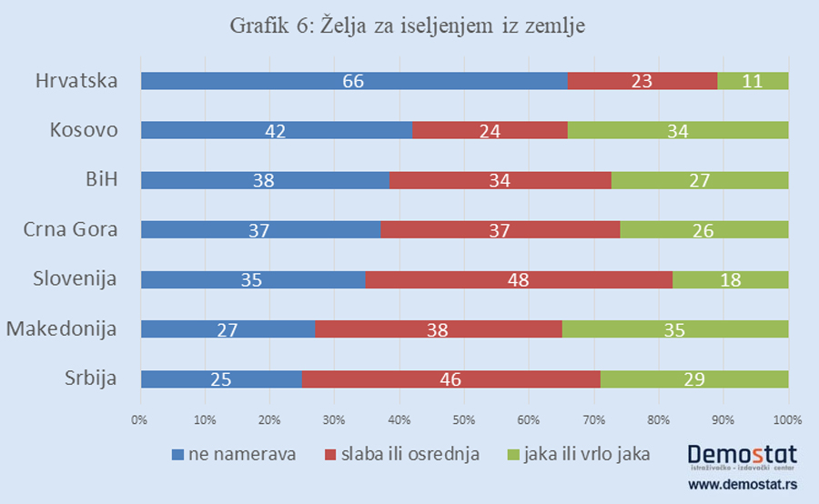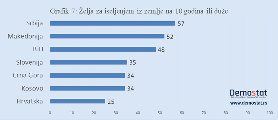 Kao što se vidi na Grafiku 6, u svakoj državi, sem u Hrvatskoj, većina mladih razmišlja o odlasku iz zemlje. Po broju mladih koji žele ili nameravaju da emigriraju Srbija (tri četvrtine njih!) Srbija je na prvom mestu među ispitanim zemljama. Vrlo blizu je Makedonija.