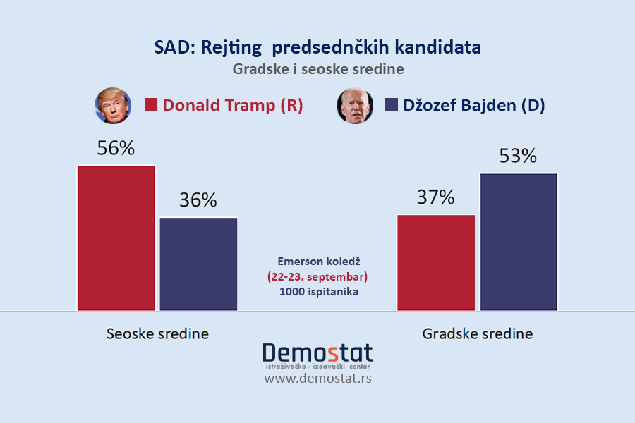 Prema rezultatima ankete koju je sproveo Emerson koledž između 22. i 23. septembra, uz učešće 1000 potencijalnih birača iz različitih delova SAD, Tramp ima snažno uporište u seoskim sredinama, gde ga podržava 56 odsto stanovnika, dok se za Bajdena odlučilo 36 odsto takvih ispitanika. S druge strane, Bajden je daleko popularniji od Trampa u gradovima, gde je odnos 53 odsto prema 37 odsto u korist demokratskog kandidata.
