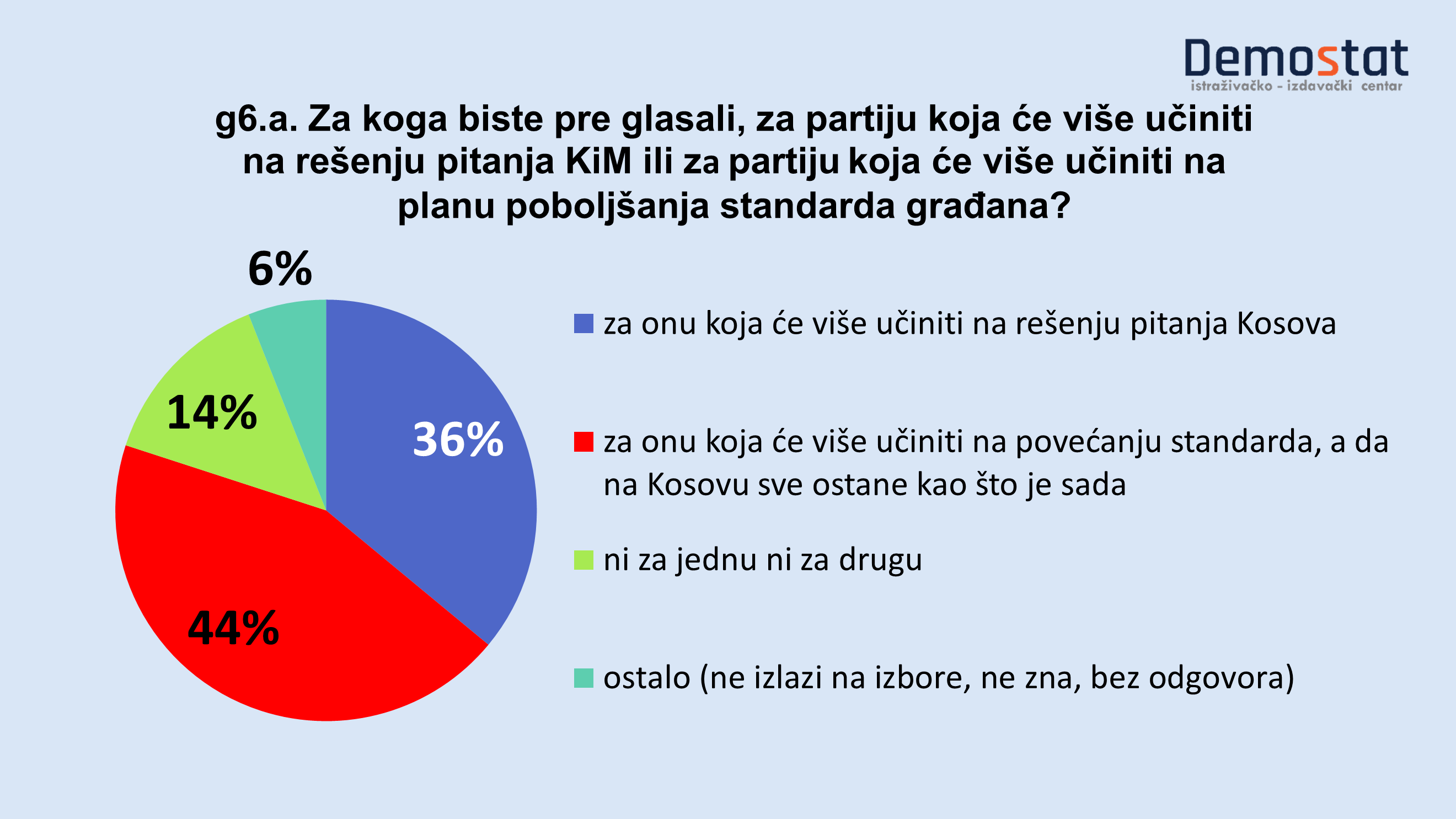 U jakom sučeljavanju težine problema Kosova i problema narodnog standarda pa i preživljavanja, ispitanike smo blago prinudili da se opredele za jedno ili drugo i to preko jedno relativno slabijeg kriterujuma: Šta više utiče na njihovo partijsko opredeljenje: Kosovo ili standard. Dobili smo rezultat po kojem se nešto veći broj ispitanika 44% opredelio za rešavanje problema standarda, a 36% za rešavanje problema Kosova.