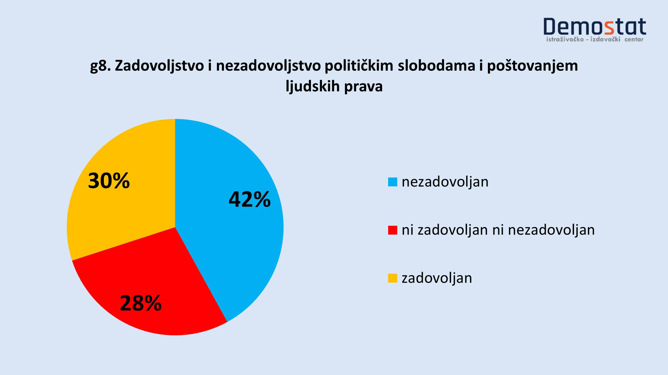 Distribucija odgovora o zadovoljstvu i nezadovoljstvu stanjem političkih sloboda i poštovanja ljudskih prava, gotovo je ista kao i u slučaju nezadovoljstva i zadovoljstva stanjem demokratije. Uostalom nema političkih sloboda i poštovanja ljudskih prava izvan demokratskih sistema, kao što nema ni demokratije bez političkih sloboda i poštovanja ljudskih prava.