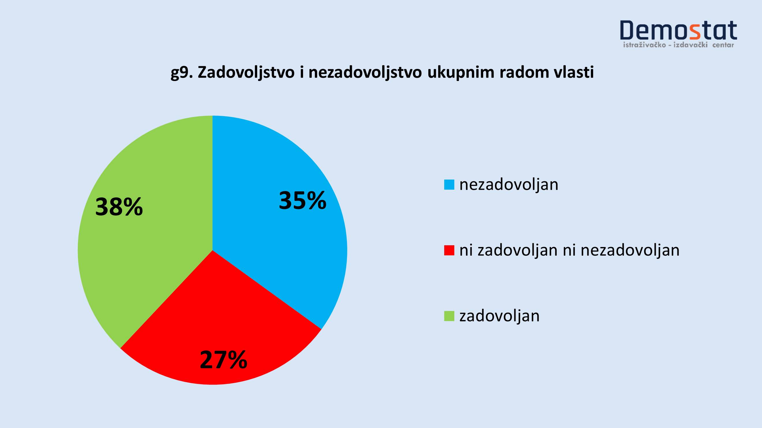 Zadovoljstvo ukupnim radom vlasti je za tri postotka veće od nezadovoljstva tim radom (38% prema 35%). Može navedeni podatak da čudi s obzirom da je znatno više aspekata rada vlasti kojima su ispitanici nezadovoljni nego onih kojima su zadovoljni, a takođe i sumirana aritmetička sredina pojedinačnih aspekata rada vlasti pokazuje veće nezadovoljstvo od zadovoljstva. Međutim, čest je nalaz po kojem je holistička ocena nekog fenomena veća od proseka zbrojenog nezadovoljstva i zadovoljstva pojedinanih aspekata datog fenomena. Uostalom, dovoljno je zadovoljstvo ili nezadovoljstvo jednom društvenom i političkom pojavom, pa da to oboji celinu ocene odnosa datog pojedinca i date pojave.