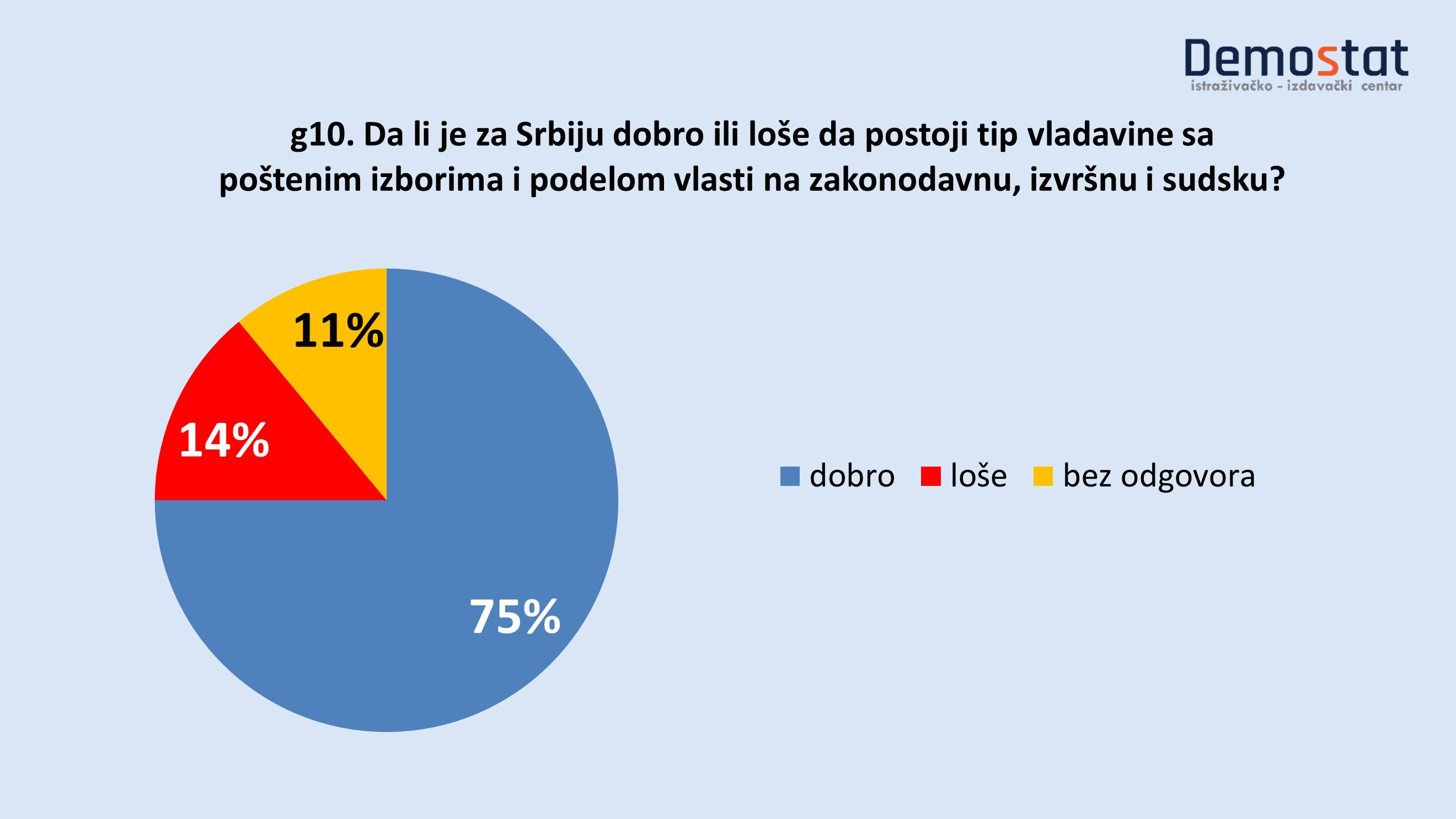 Pet puta je veći broj ispitanika (tačno tri četvrtine) koji misle da je za Srbiju dobro da postoji tip vladavine sa poštenim izborima i podelom vlasti na zakonodavnu, izvršnu i sudsku, od broja ispitanika koji misli da je to loše za Srbiju (14%). Pošteni izbori i podela vlasti bili su nam indikatori preferencije demokratije kao poželjnog tipa vladavine. Ovome svakako treba pridodati podatak koji smo malo pre pomenuli: 44% ispitanika je nezadovoljn stanjem demokratije u Srbiji, naspram 29% zadovoljnih.