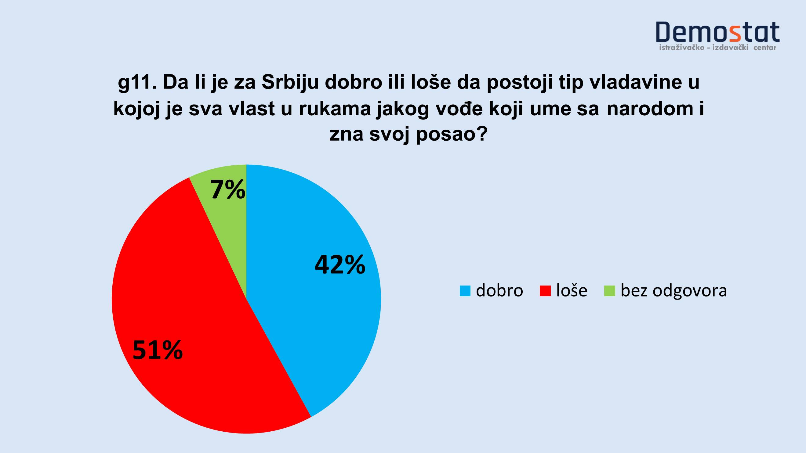 Donekle je iznenađujući podatak da je polovina ispitanika ocenila kao loše „vladavine u kojoj je sva vlast u rukama jakog vođe koji ume sa narodom i zna svoj posao“ s obzirom da u Srbiji imamo vladavinu upravo takvog tipa, barem prema profilisanju od strane samog naroda. Doduše, nimalo nije za potcenjivanje postotak ljubitelja autoritarne vladavine. Ona zaostaje tek za devet postotaka od onih ispitanika koji tu vladavinu ocenjuju kao lošu. Zanimljivo je da je broj neodgovora na ovo pitanje relativno mali, u svakom slučaju jedan od najmanjih u ovom istraživanju.