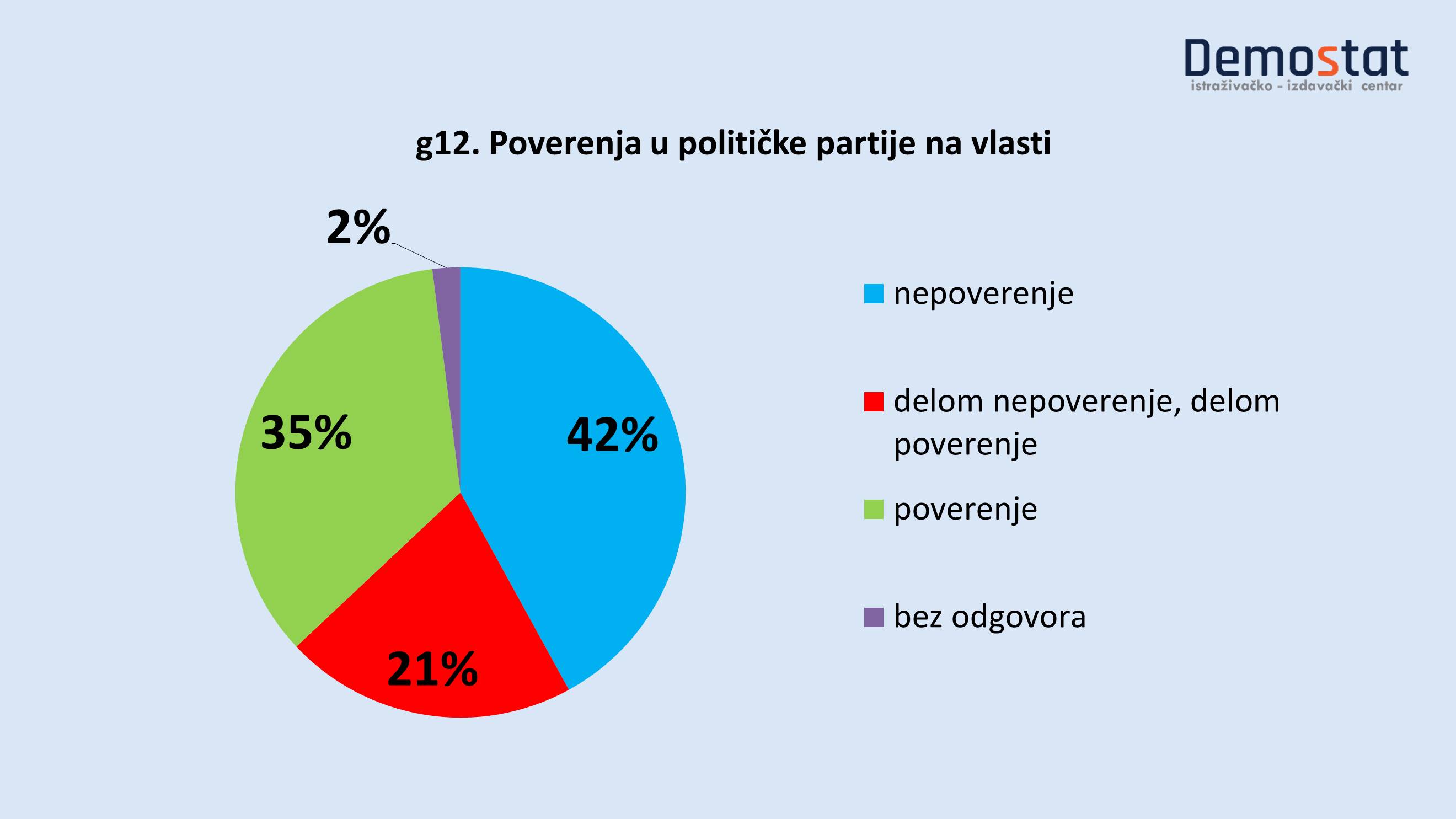 Poverenje u političke partije na vlasti je manje za sedam postotaka u odnosu na nepoverenje (35% prema 42%). Ako bi, uslovno rečeno podelili postotak onih ispitanika koji su rekli da imaju delimično poverenje i delimično nepoverenje prema partijama na vlasti, onda bi taj odnos bio gotovo pola-pola pa bi mogli da kažemo da je nepoverenje prema partijama vlasti obeležili polovinu ispitanika (52-53%), a poverenje u ove partije nešto slabija polovina (45-46%).