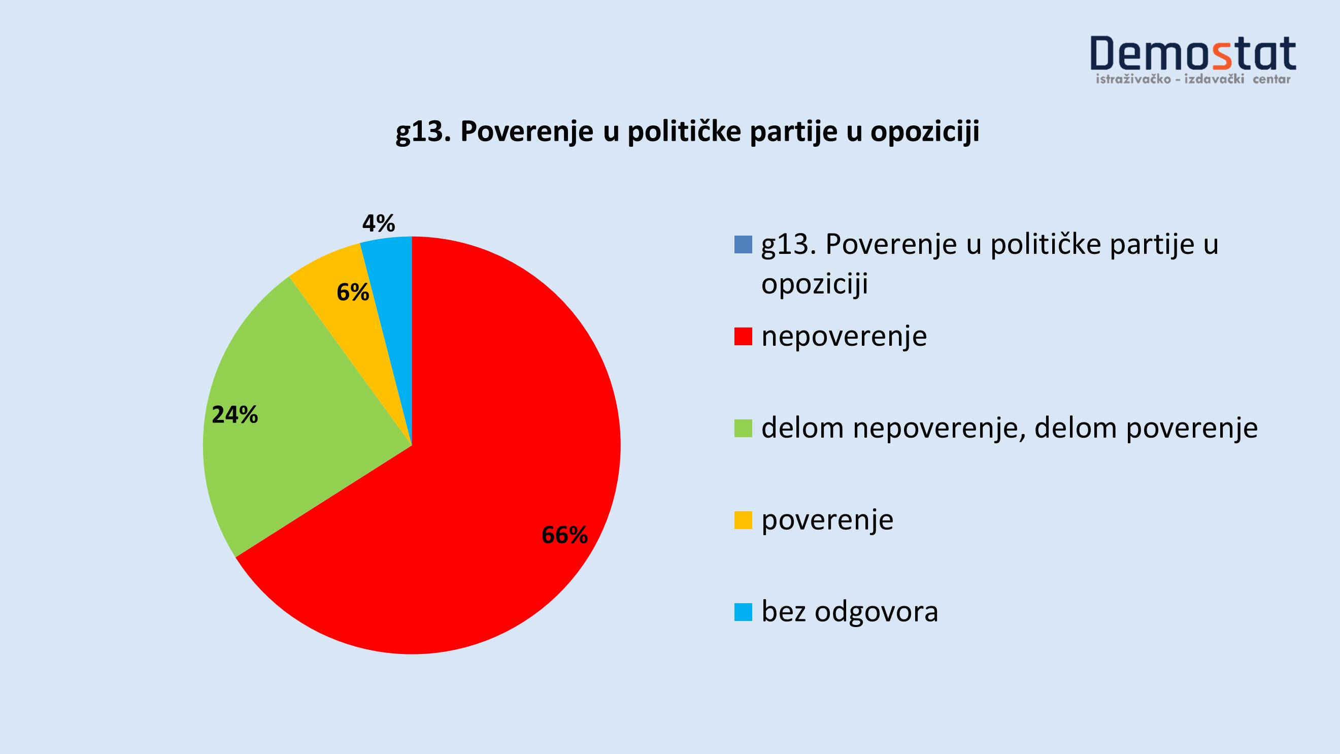 Poverenje u političke partije u opoziciji je jedanaest puta manje od nepoverenja (66%). Ako bi i u ovom slučaju podelili postotak ispitanika koji su faktički neodlučni jer imaju i poverenje i nepoverenje, onda bi postotak nepoverenja u opozicione partije iznosio čak 78%, a postotak poverenja 18%. Po svemu sudeći ovakvom statusu opozicije doprinelo je ponašanje opozcionih partija (tačnije, njihovih lidera) na izborima krajem prošle godine i ovogodišnjim izborima. U jednoj gruboj proceni može se reći da opozicione partije (njihovi lideri) lelujaju između međusobnioh sukoba i sukoba sa vladajućim strankama i njihovim liderima.