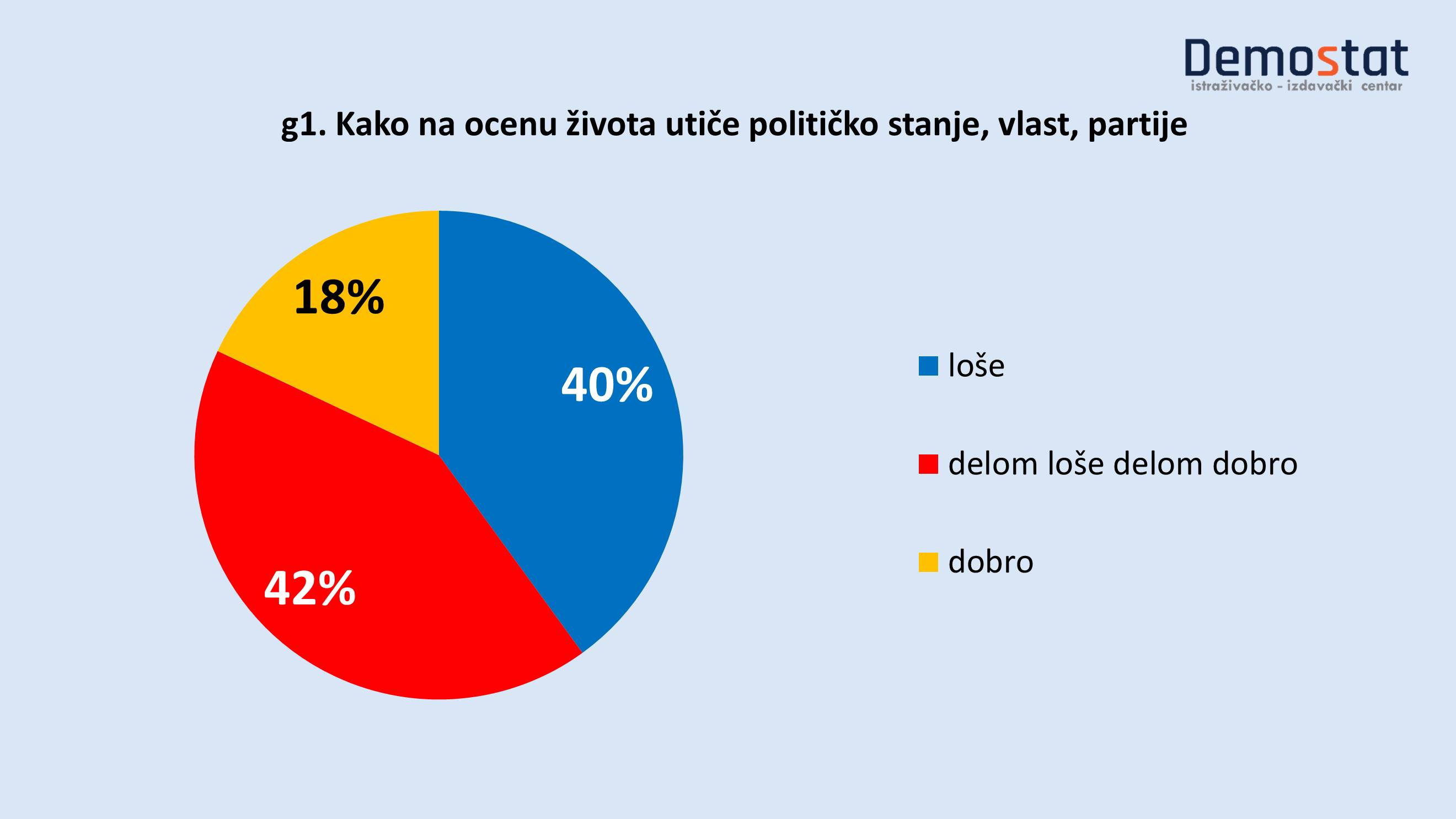 Na prethodnoj prezentaciji osnovnih nalaza istraživanja Demostata istakli smo kao jedan od nekoliko osnovnih nalaza, činjenicu da je većina ispitanika (66%) zadovoljna životom a istovremeno nezadovoljna radom vlasti u 10 relevantnih oblasti političkog rada i da nema poverenja u najvažnije aktere političkog života. Upravo takav nalaz potvrdili su sami ispitanici u odgorima na direktno pitanje: „Kako na ocenu života utiče političko stanje, vlast, partije?“. Dve petine ispitanika je odgovorilo da politika loše utiče ocenu života, nepuna petina je rekla da dobro utiče a dve jake petine je dala odgovor po kojem politika utiče delom loše a delom dobro.