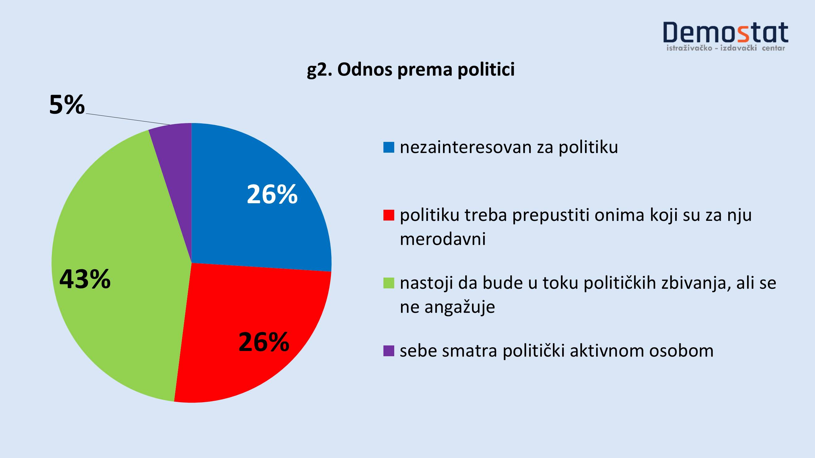 Druga strana pitanja je kako politika utiče na život naroda, a kako narod utiče na politiku. Podaci pokazuju da je nešto više od polovine ispitanika faktički nezainteresovana za politiku. Ili, konkretnije, četvrtina je direktno rekla da nije zainteresovana za politiku, a takođe četvrtina je to isto rekla nešto zaobilaznijim putem. Naime oni su rekli da politiku treba prepustiti merodavnim ljudima, a pre svega političarima. Druga polovina ispitanika je pokazala izvestan interes za politiku, pri čemu se nešto više od dve petine informiše o političkim stvarima ali se ne angažuje, dok se u političke aktivnosti uključuje svega 5% ispitanika.