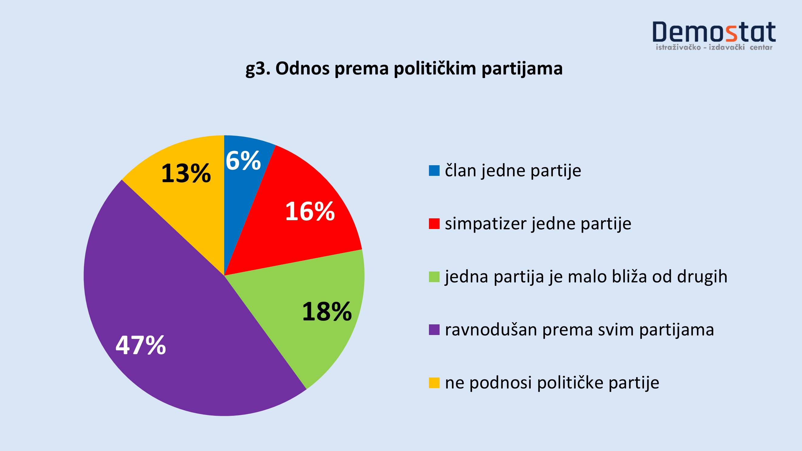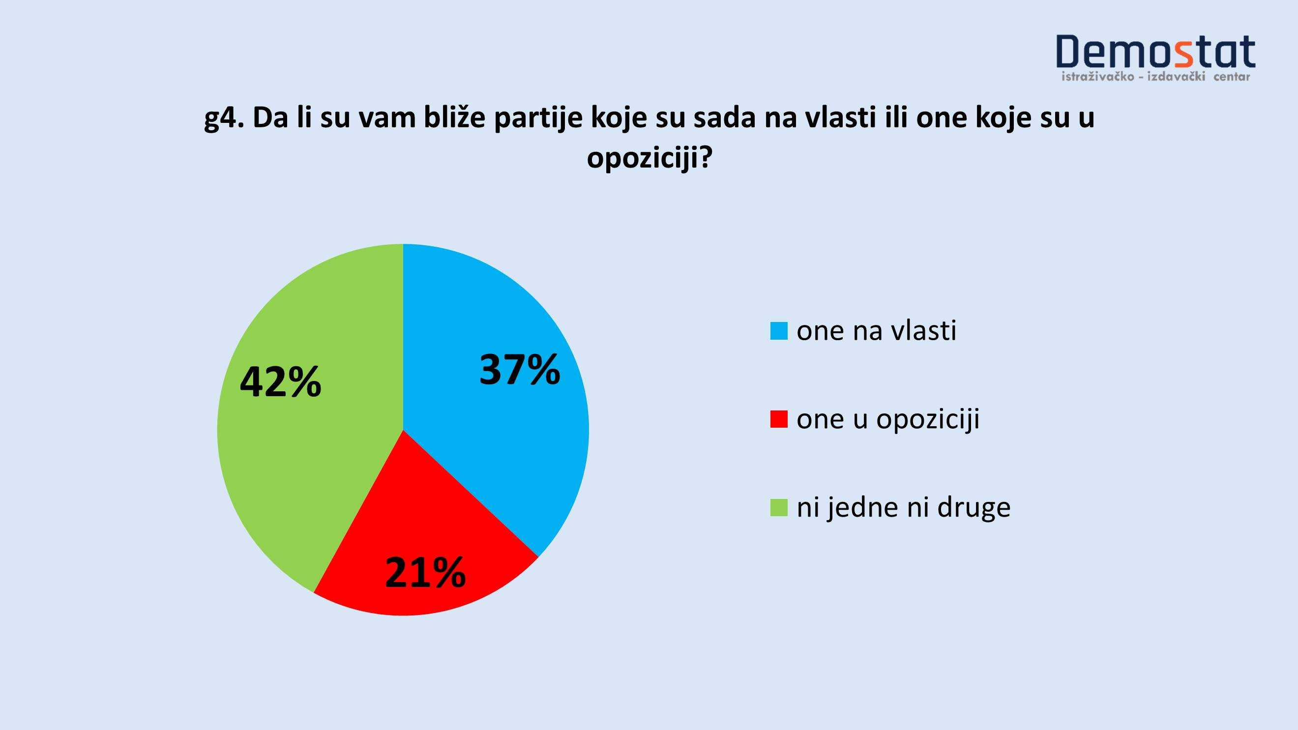 Pitanje o bliskosti građana sa političkim partijama podeljenim u grupu partija koje su na vlasti i grupu partija koje su u opoziciji nam je poslužilo kao zamena standardog pitanja o partijskoj identifikaciji uz navođenje pojedinačnih partija. Jednostavno nismo mogli da tražimo od ispitanika odnos prema pojedinačnim partijama zbog malih brojeva ispitanika koji se vezuju za gotovo sve opozicione stranke (u kontekstu malog uzorka – 1200 ispitanika). U svakom slučaju dobili smo orijentacioni podatak po kojem partije na vlasti imaju nepune dve petine simpatizera, a partije opozicije jednu petinu. U svakom slučaju dobili smo potvrdu aktuelnog apartizma s obzirom da je dve petine ispitanika reklo da ne podonosi ni jedne ni druge.