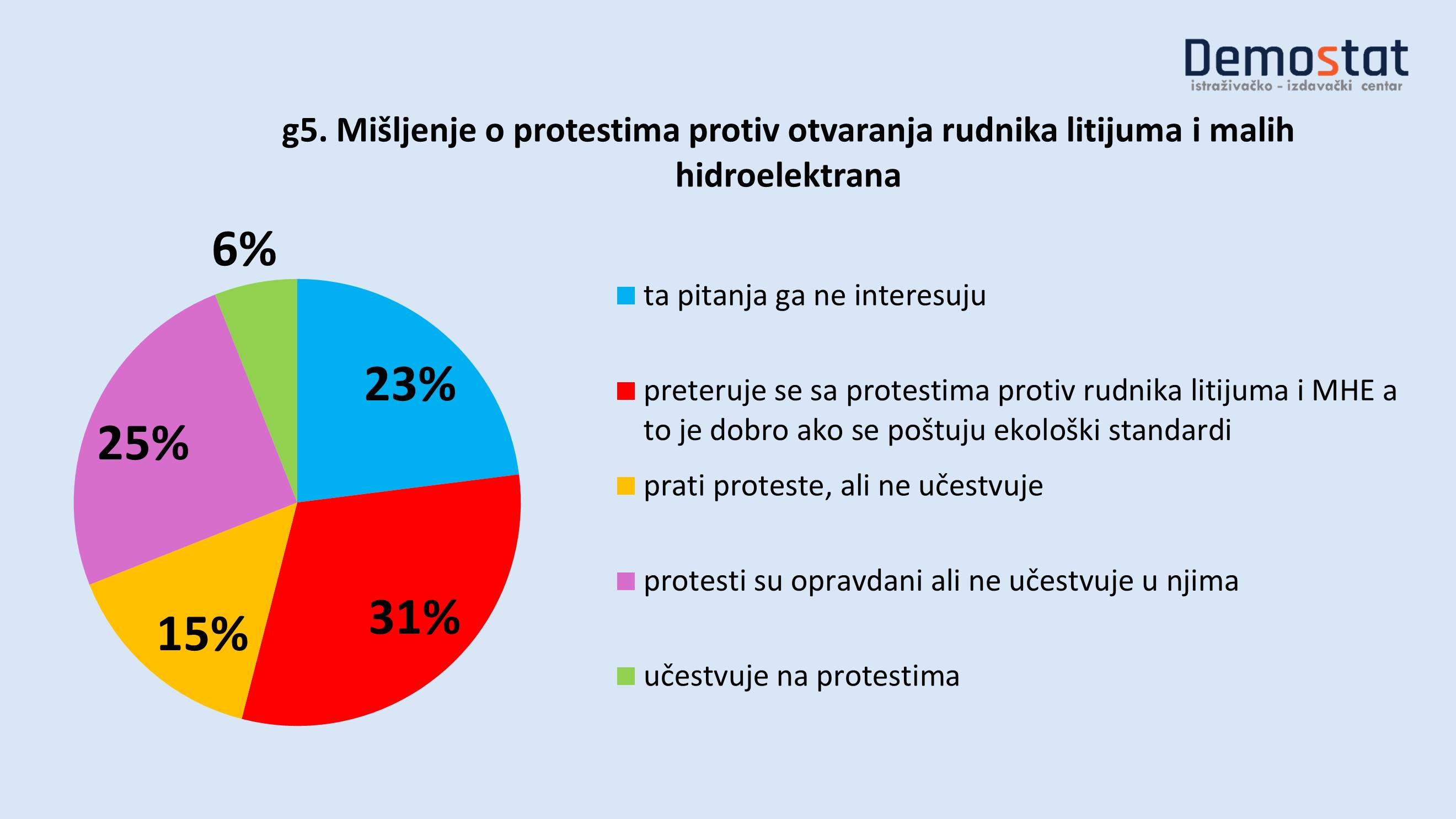 Još na prvom predstavljanju istraživanja Demostata naglasili smo da nije bilo primereno postavljanje direktnog pitanja: Da li ste za ili protiv „kopanja litijuma“ pre svega zbog haotičnog informisanja o ovoj temi sa naglašenom političkom polarizacijom za i protiv uz puno odsustvo stručnih argumenata. Naše pitanje je postavljeno tako da omogućava odgovore navijača Za i Protiv, ali i da se iskaže informisanost o temi, kao i posredno iskazivanje nezainteresovanosti za temu. U svakom slučaju nepuna četvrtina ispitanika je direktno odgovorila da ih tema ne interesuje, dok je nepuna trećina iskazala na jedan blagi način odsustvo interesa za temu: „preteruje se sa protestima ali ako se poštuju ekološki standardi…“.