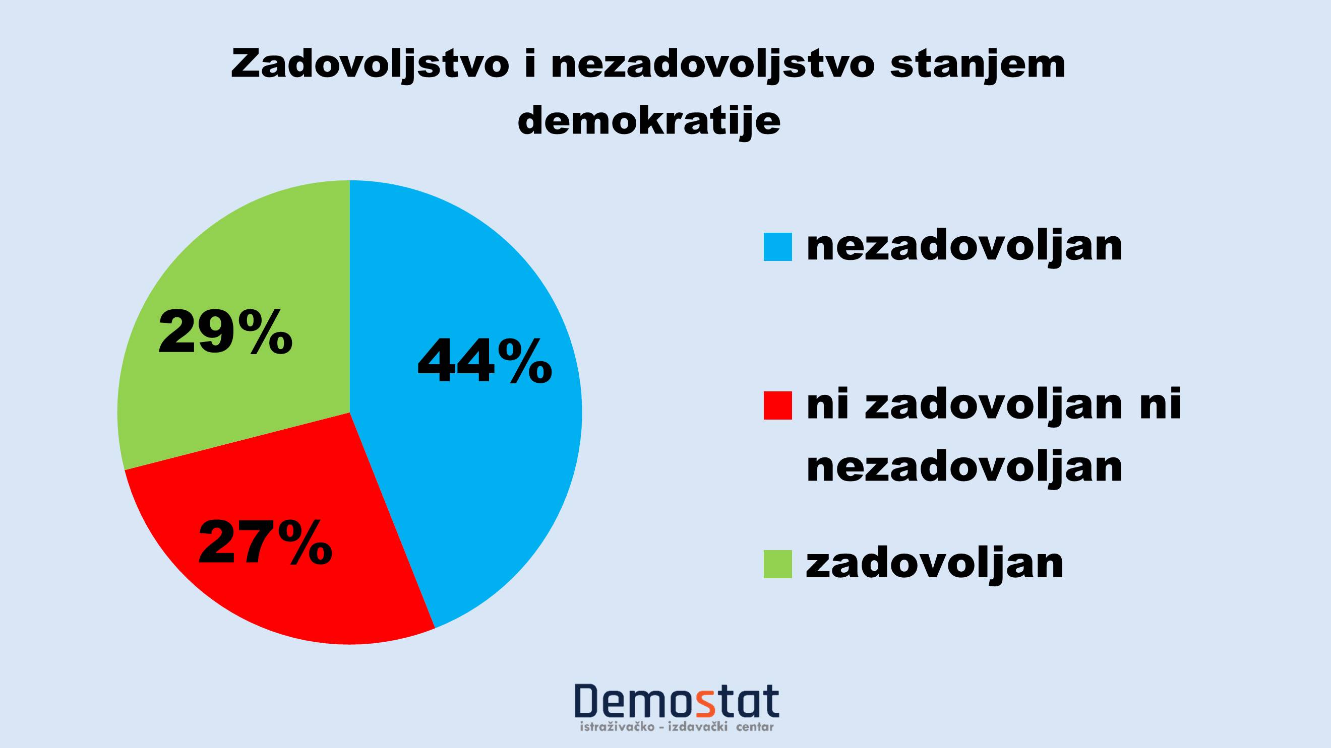 Nezadovoljno je stanjem demokratije u Srbiji 44% ispitanika, a zadovoljno je 29%, a tu je i 27% onih koji su delom zadovoljni a delom nezadovoljni.