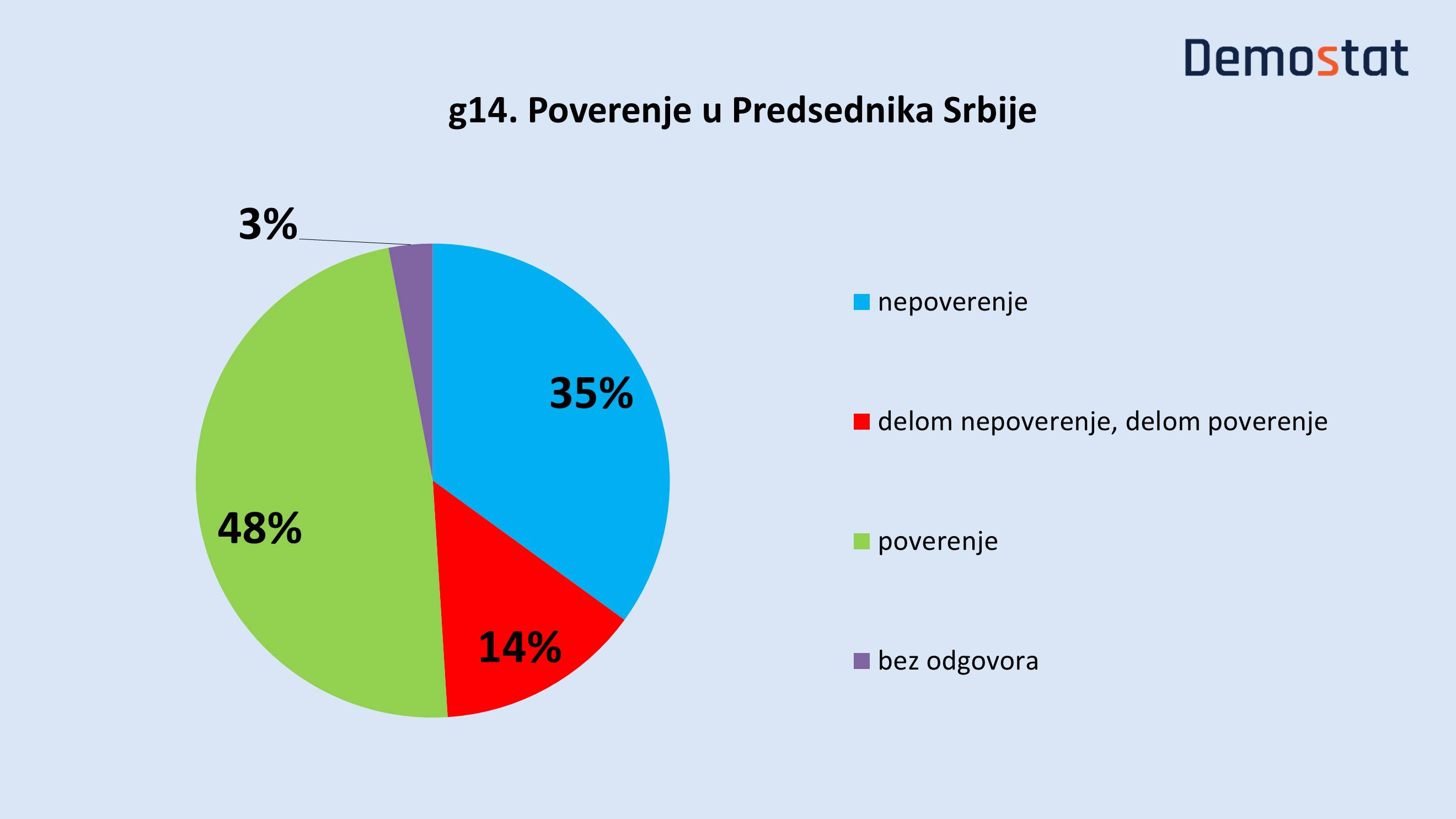 Najveće je poverenje naroda u predsednika Srbije, to poverenje iskazuje gotovo svaki drugi ispitanik (48%). Nepoverenje prema predsedniku približno ima svaki treći ispitanik (35%). Imajući u vidu oba podatka može se reći da je Aleksandar Vučić spiritus movens ne samo napednjačke već i srpske. Vučić, kao omiljeni izbor naroda, jači je ne samo od lidera drugih stranaka, već je jači i od sopstvene stranke. Nema vidljivih konkurenata ni u svojoj stranci. Njegovi sateliti čuvajući i uzdižući Vučića, čuvaju svoj položaj i svoju političku budućnost. Sve u svemu, on je slika i prilika podaničke Srbije. Njegov autoritarni narod slavi svog autoritarnog vođu. Da njega nema narod bi izmislio nekog drugog, a Vučiću ne treba drugi narod, za sada je zadovoljan svojim podanicima.