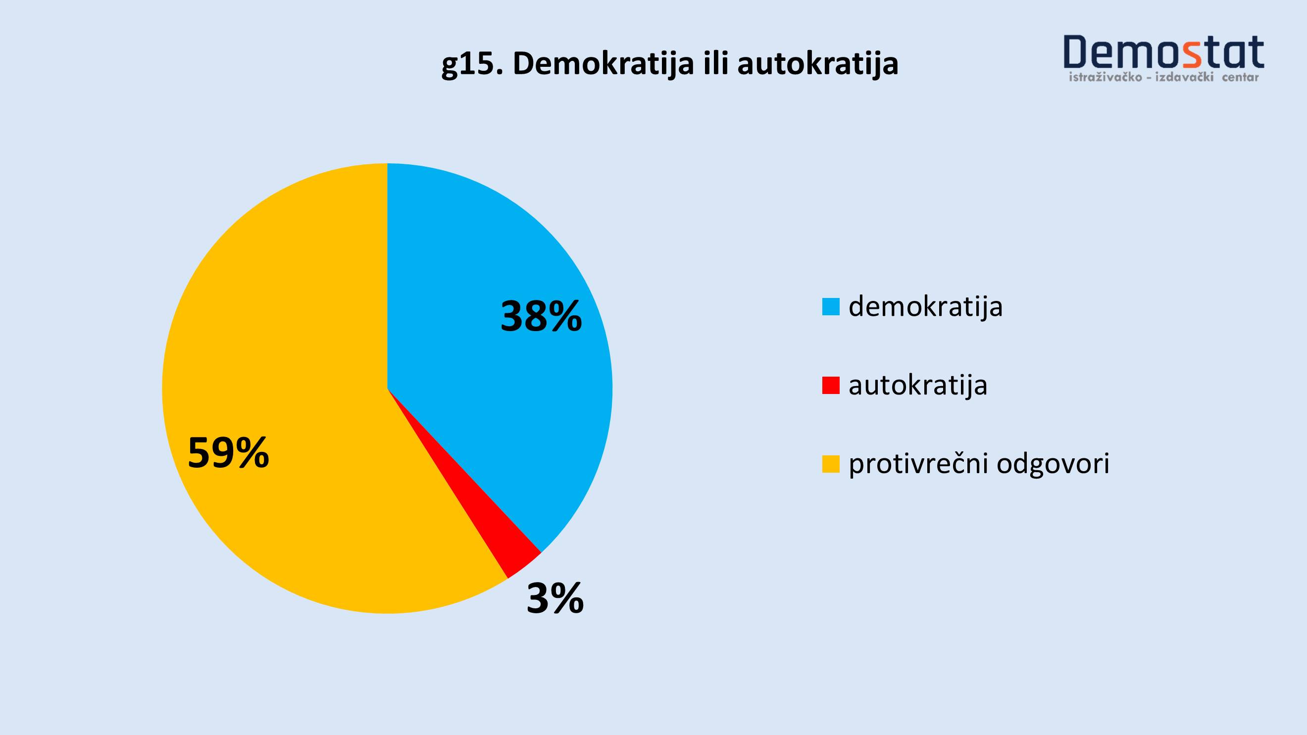 Ma koliko to možda izgledalo čudno, dilema demokratija ili autokratija, najveći broj ispitanika razrešio je izborom i jedne i druge opcije. Tri petine ispitanika je reklo da je dobra i demokratija i da je dobra autokratija (isto kao srpsko razrešenje dileme istok ili zapad: i zapad i istok). Daleko jasnije je opredeljenje onih ispitanika koji su imali na umu da treba da kažu kojoj su opciji skloniji, demokratskoj ili autokratskoj. Čak 13 puta češće se izjasnilo za demokratiju (38%), a svega 3% za autokratiju. No kad se ovi podaci uporede sa poverenjem u nosioce praktikovanja deomkratije i autokratije, i sa izbornim ponašanjem punoletnih građana, onda se vidi dominacija autokratske prakse (naspram formalne demokratije).