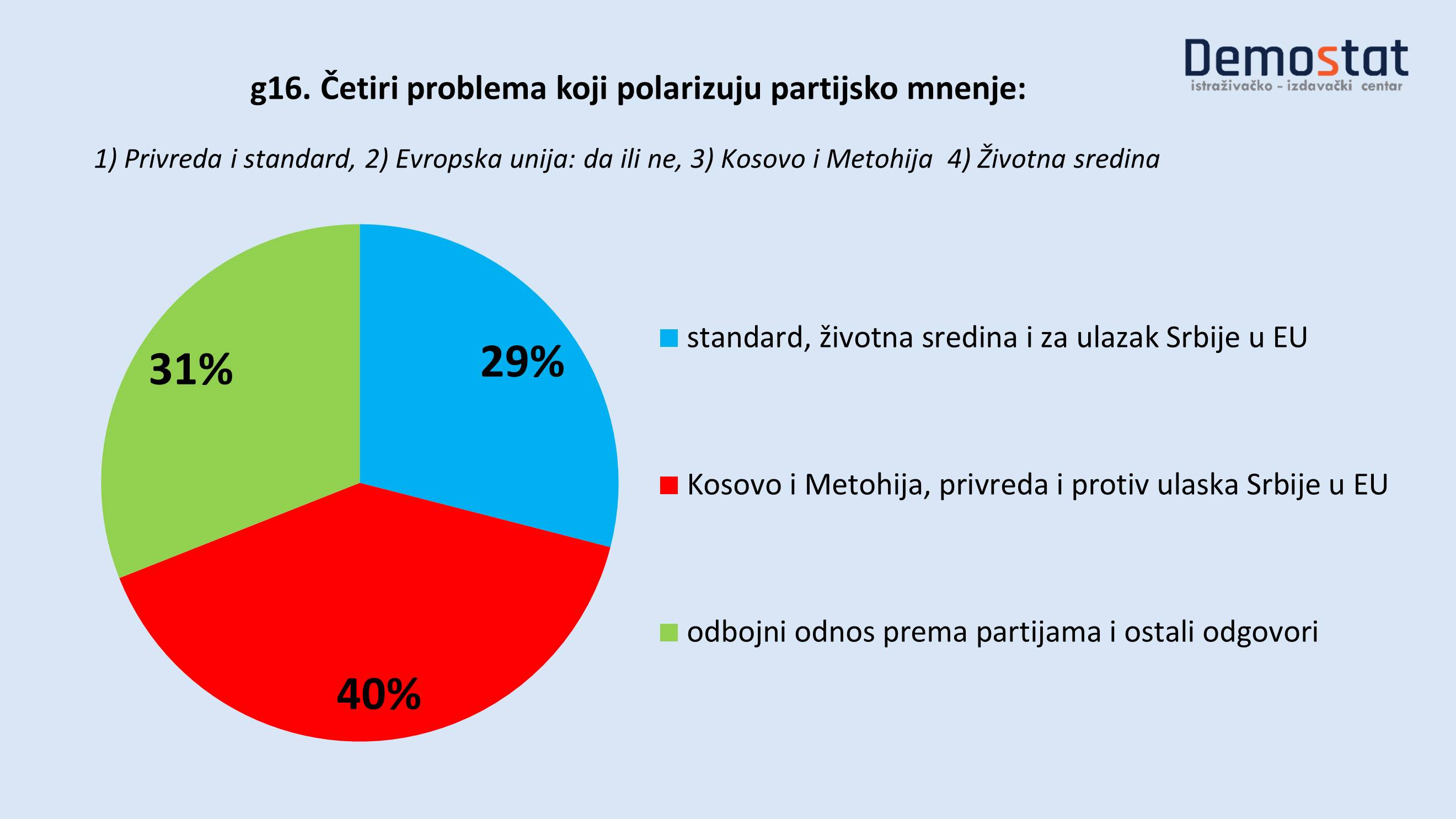 U istraživanju smo testirali rejting i međusobnu povezanost kombinacija četiri kompleksa političkih i društvenih problema: 1) Privreda i standard, 2) Evropska unija: da ili ne, 3) Kosovo i Metohija i 4) Životna sredina. Od ispitanika smo tražili da se opredele za neke od datih opcija kao motiva za izborno opredeljenje: „Za koga bi pre glasali…“ i potom smo navodili izborno zastupanje navedenih opcija. Ostale odgovore, a pre svih odbojni odnos prema partijama – navelo je 31% ispitanika.