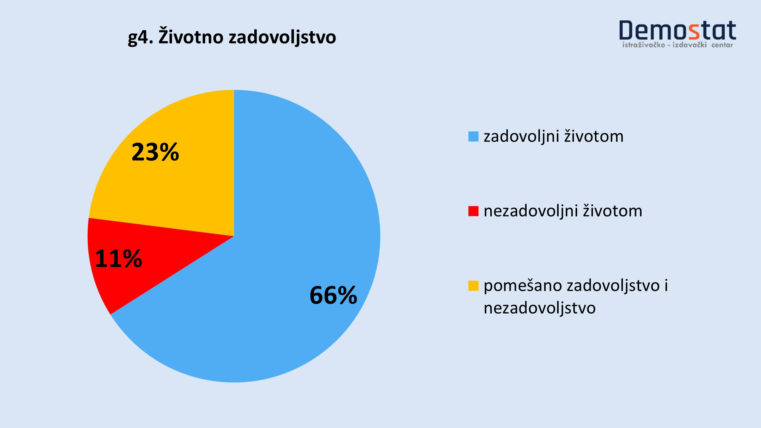 Od ispitanika smo tražili jedan holistički odgovor na ovako postavljeno pitanje: „Koliko ste zadovoljni a koliko nezadovoljni vašim životom u celini?“. Dobili smo odgovore po kojima je svaki deveti ispitanik (11%) nezadovoljan životom, dve trećine ispitanika je zadovoljno životom (66%), dok je nepuna četvrtina (23%) dala odgovore u kojima je pomešano i zadovoljstvo i nezadovoljstvo uz nešto malo ne-odgovora.