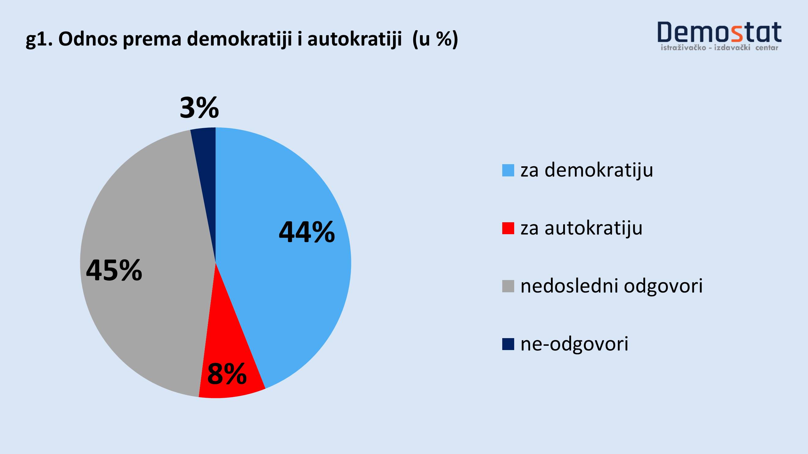 Kada smo povezali odgovore na pomenuta pitanja došli smo do toga da se za demokratiju izjasnilo 44% ispitanika, oni su rekli da je demokratija dobra a autokratija je loša. Za autokratiju se izjasnilo 8% ispitanika, oni su rekli autoktratija je dobra, demokratija je loša. Nedosledne odgovore dalo je 45% ispitanika. Na oba ili na jedno pitanje nije odgovorilo 3%.