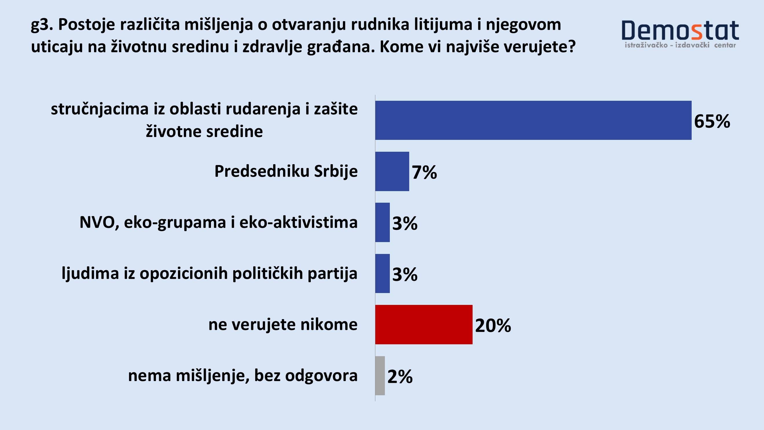 U započetoj javnoj diskusiji o „kopanju“ litijuma čujemo od stručnjaka dva suprotstavljena mišljenja – za i protiv „kopanja“ litijuma. Pa kojim stručnjacima da narod poveruje (videti grafikon 3). Videli smo da četiri petine ispitanika navodi neke subjekte kojima veruje, dok jedna petina ne veruje nikome. Čak dve trećine ispitanika tvrdi da veruje stručnjacima (65%), predsedniku Srbije veruje sedam posto, ljudima iz opozicije tri posto i isto toliko i eko-aktivistima.