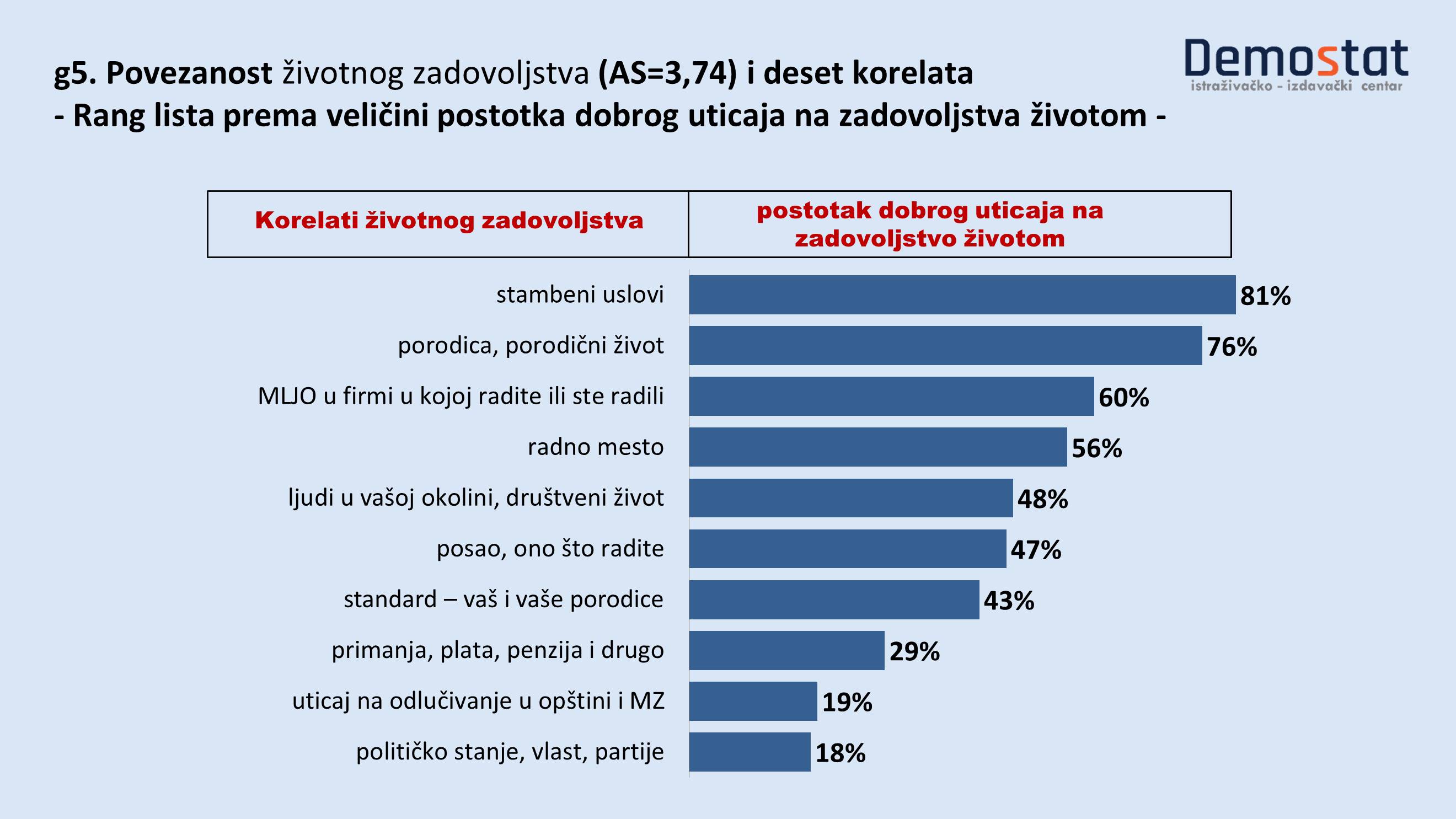 Zanimljivi su podaci o postotku dobrog uticaja korelata na životno zadovoljstvo (videti grafikon 5). U prvoj grupi korelata su stambeni uslovi (81%) i porodica i porodični život (76%). U drugoj grupi su međuljudski odnosi u firmi u kojoj ispitanik radi (ili je radio pre penzionisanja), potom radno mesto, ljudi u ispitanikovoj okolini i njegov društveni život, ispitanikov posao i njegov standard i standard njegove porodice. Postoci u ovoj grupi kreću se od 43% u slučaju standarda do 60% u slučaju međuljudskih odnosa. U trećoj grupi su ispitanikova primanja (plata, penzija i dr.) sa 29%, a potom dva korelata vezana za politiku na lokalnom nivou (19%) i na republičkom nivou (18%).