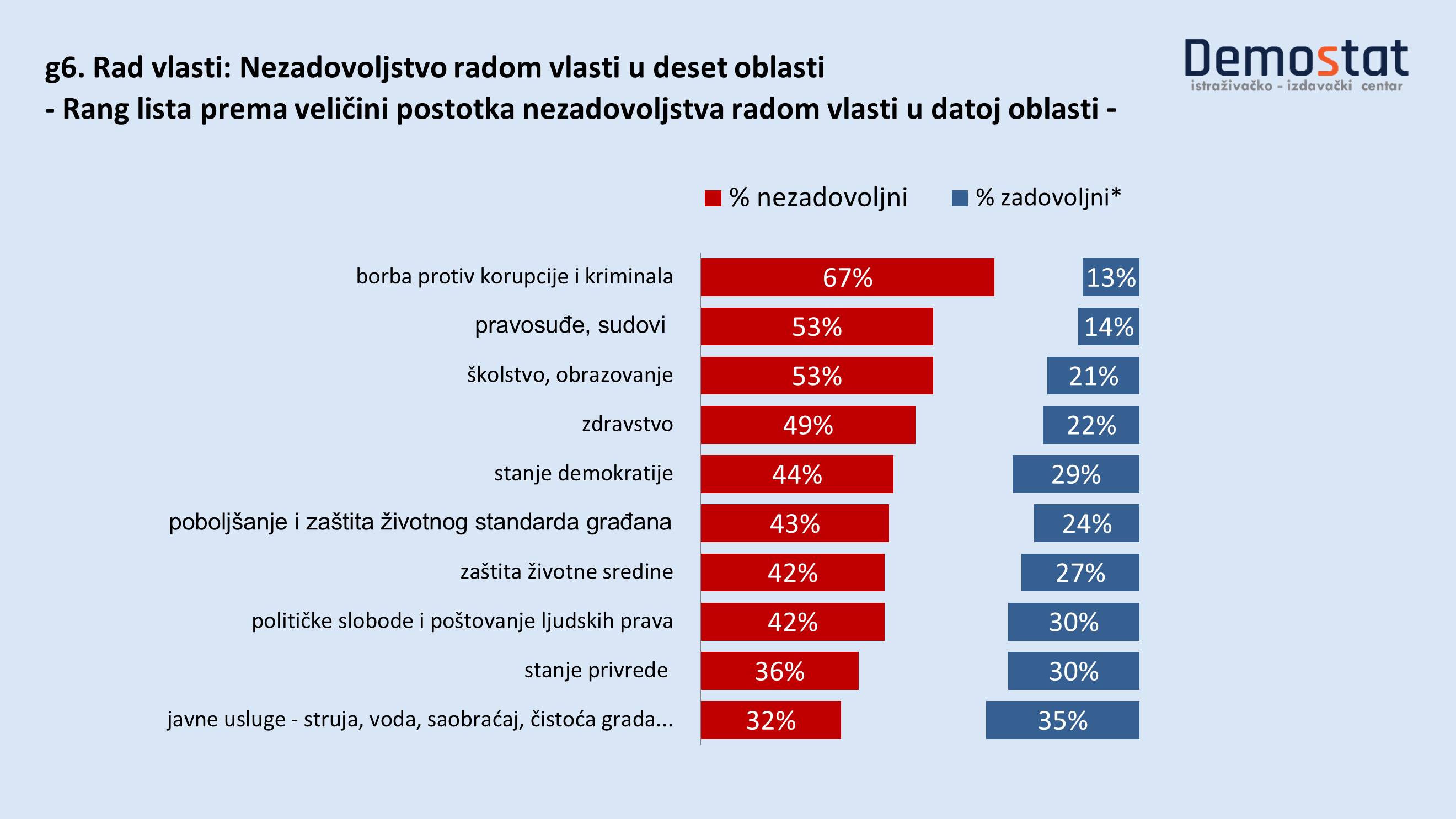 Narod Srbije je nezadovoljan radom vlasti u deset oblasti koje vlast uređuje i organizuje. U proseku nezadovoljno je radom vlasti 46% ispitanika a 25% je zadovoljno.