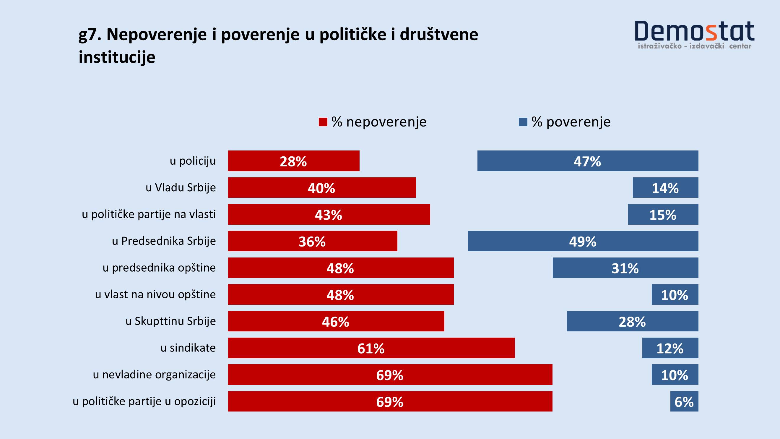 Najveće nepoverenje je prema sindikatima (61%) i prema nevladinim organizacijama i političkim partijama u opoziciji (po 69%). Uz ove podatke treba reći da su jedino ove tri institucije imale nadpolovično nepoverenje. – Videti grafikon 7.